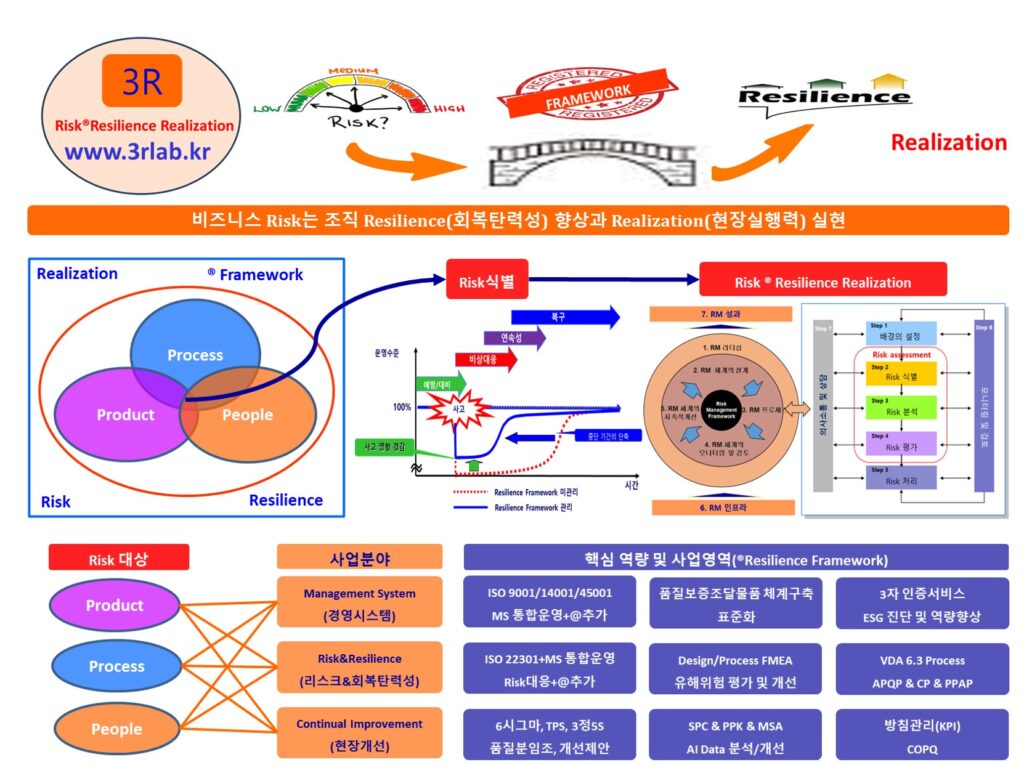 - 비즈니스 리스크를 사전에 제품 Lifecycle 각 단계에서 식별하여 사전에 이를 예방 및 대비하고, 사고(Event)가 발생하면 신속하게 목표한 시간 이내로 대응, 복구 할 수 있는 3R Lab의 방법론을 통하여 조직의 회복탄력성을 향상과 지속적 성장이 가능하도록 협력하는 리스크®레질리언스 연구소 입니다.